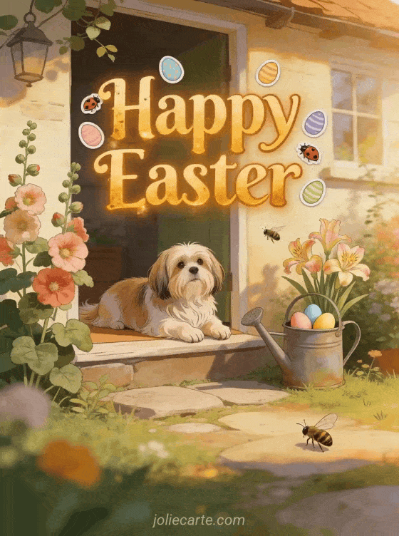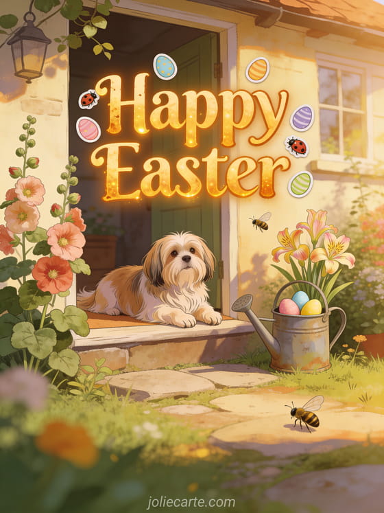 Send these charming Easter cards featuring a Lhasa Apso lying on a cottage doorstep surrounded by hollyhocks and alstroemeria, a vintage watering can with Easter eggs peeking out, bumblebees buzzing in the golden afternoon light. A warm and inviting countryside scene. Discover also a free Easter card, an Easter greeting card or a happy Easter holidays card.