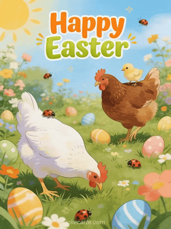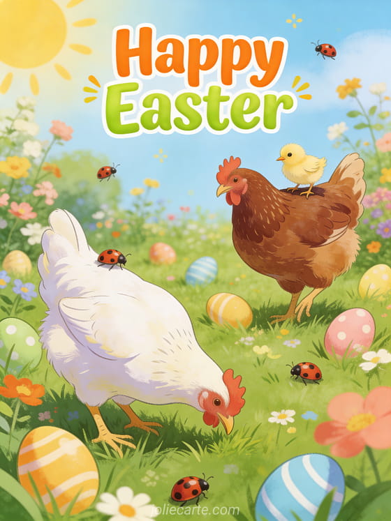 Share this cheerful Easter hens card and spread the joy of spring. Discover also an Easter bunny image card or a happy easter cute card.