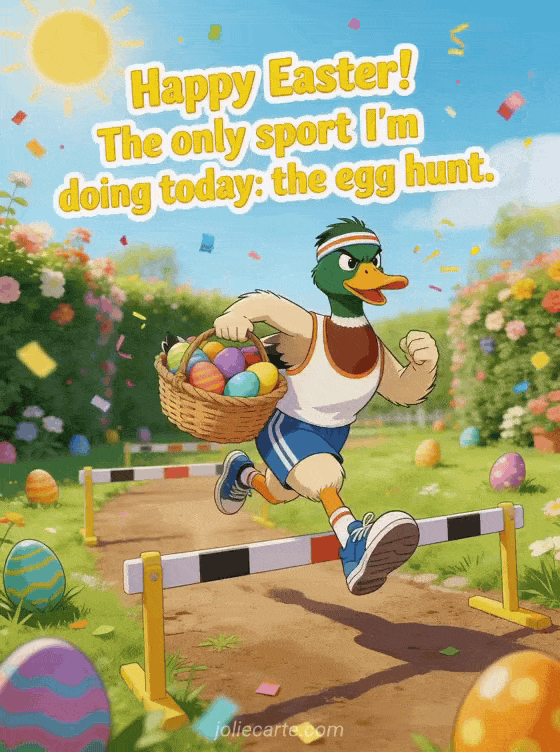 Send a hilarious Easter greeting with a sporty duck running an egg hunt obstacle course. The only sport worth doing today! Discover also funny Easter images or a happy Easter Monday humor card and a humorous Easter greeting.