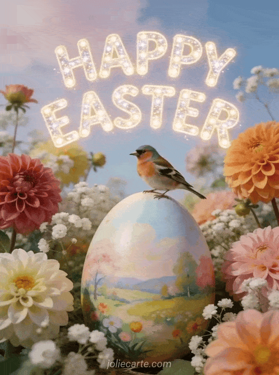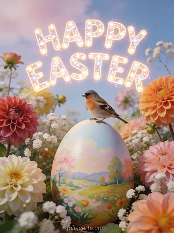 Brighten someone’s Easter with this dazzling video greeting card. A charming goldfinch sits atop a giant Easter egg painted with a spring landscape, surrounded by vibrant dahlias and baby’s breath under a soft sky. Discover also a Happy Easter message card or a Easter wishes card.