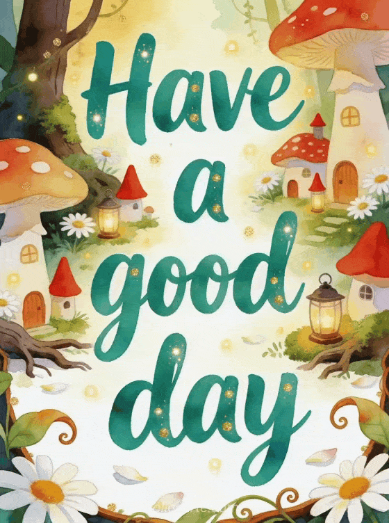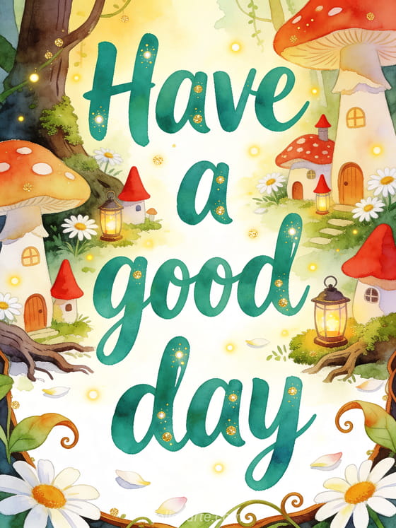 Share a bright good day message with mushroom cottages, tiny red pointed hats, lanterns, daisies and mossy forest roots. Discover also have a good day cat gifs, good morning and good day images or sunny good day text.