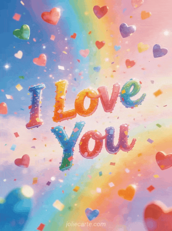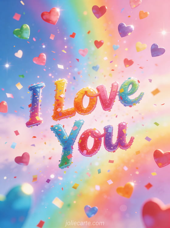 Send this joyful greeting card featuring a rain of colorful hearts falling from the sky on a luminous pastel rainbow background. Discover also an I love you too card or an I love you to infinity card.