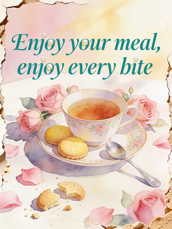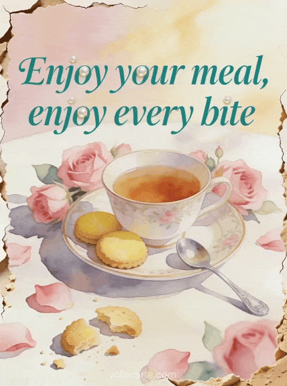 Share an elegant enjoy your meal wish with a porcelain tea cup, lemon biscuits, a silver spoon and pink roses. Discover also a sparkling enjoy your meal image, enjoy your meal animated images or an enjoy your meal animated gif gif.