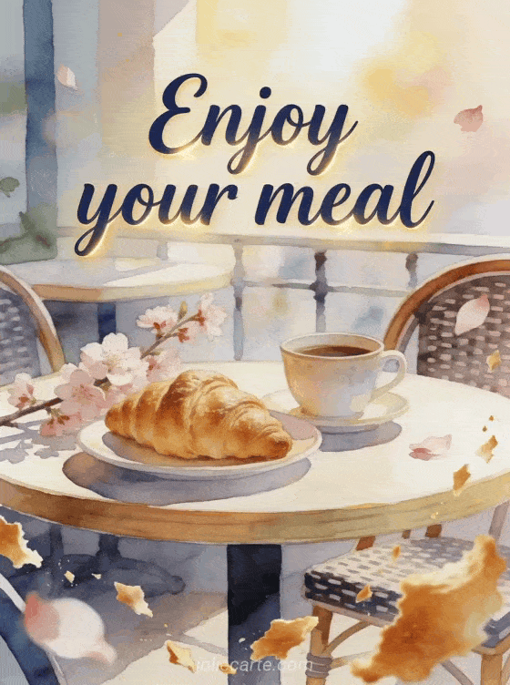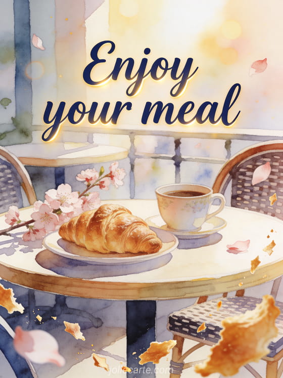Send a warm enjoy your meal greeting with a flaky croissant, a porcelain coffee cup and cherry blossom sprigs on a sunlit bistro table. Discover also enjoy your meal beautiful images, a sparkling enjoy your meal image or enjoy your meal animated images.