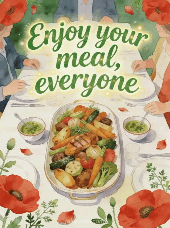 Send a welcoming enjoy your meal greeting with a shared table, roasted vegetables, sauce bowls and red poppies. Discover also enjoy your meal gif animated, kisses enjoy your meal kisses gif or enjoy your meal image gif.