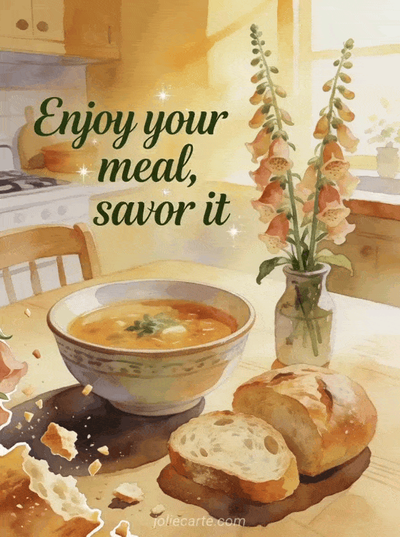 Send a warm enjoy your meal greeting with a ceramic soup bowl, crusty bread and tall foxglove stems in a small vase on a cozy kitchen table. Discover also enjoy your meal images, enjoy your meal my darling images or enjoy your meal facebook images.