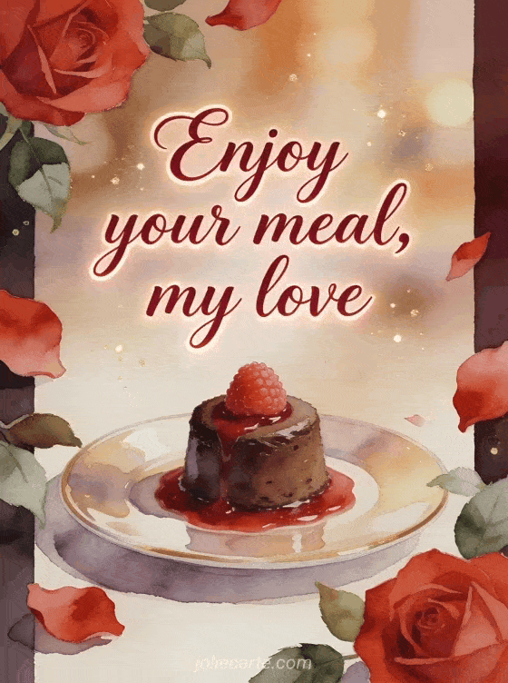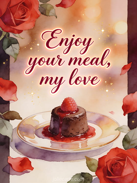Send enjoy your meal, my love with ruby calligraphy, a chocolate fondant with raspberry sauce on a glossy dessert plate and red rose petals. Discover also sms to say enjoy your meal to a friend, enjoy your meal cat gif or animated gif animated gif bon appetit.