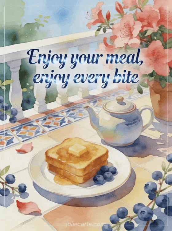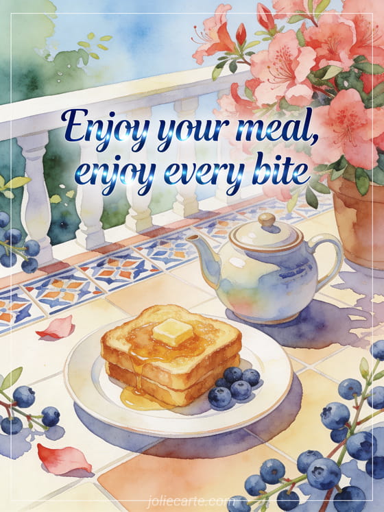 Share a joyful enjoy your meal message with a ceramic teapot, honey toast, blueberries, azalea flowers, and patterned terrace tiles in watercolor. Discover also an enjoy your meal written image, enjoy your meal text, or an enjoy your meal my darling image.