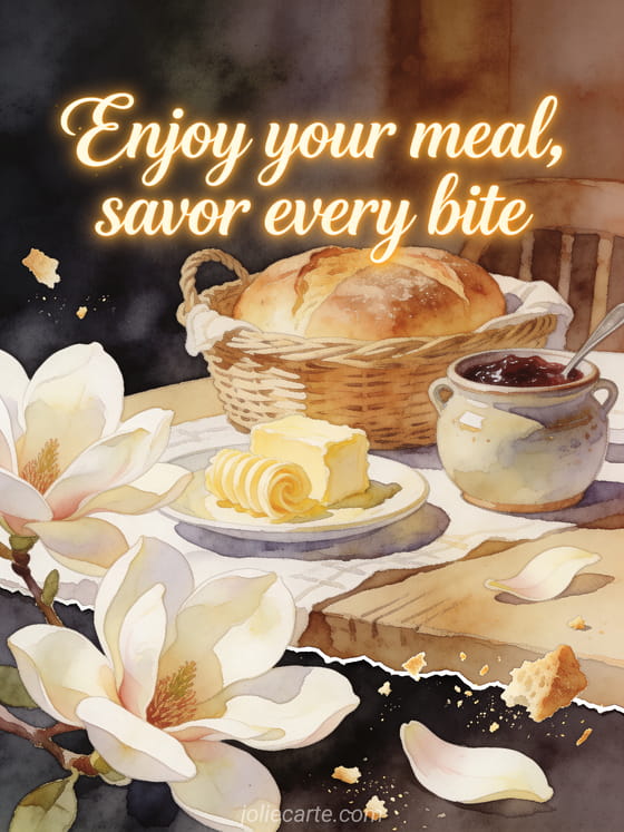 Share a generous enjoy your meal wish with a rustic watercolor table, a bread basket, butter curls, a jam pot and magnolia blossoms. You can also send enjoy your meal my darling image, choose a free enjoy your meal image or share enjoy your meal wishes images.