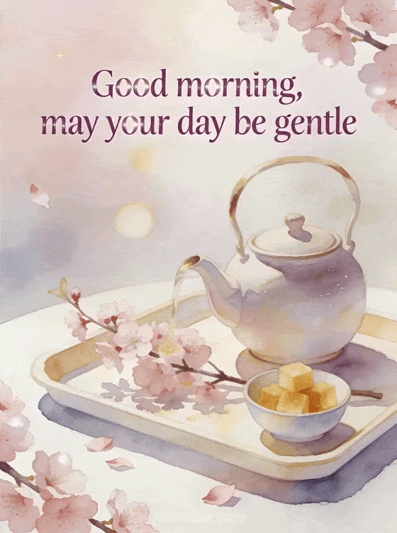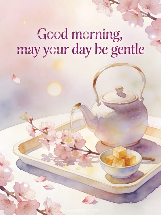Send an example of a good morning message with soft plum watercolor lettering, a ceramic teapot, cherry blossom branches, golden sugar cubes and a bright breakfast tray. Discover also touching good morning message, early morning good morning message or animated virtual good morning card.
