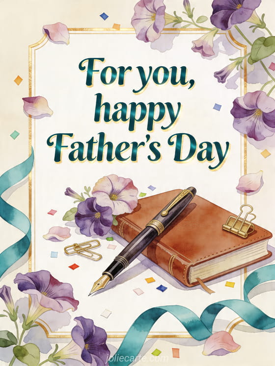 Send an elegant Father's Day card design with a detailed gouache illustration of a vintage fountain pen, a closed leather journal, petunia blossoms, brass paper clips and cheerful confetti. Discover also happy father's day to my son, happy father's day to my uncle or free Father's Day images.