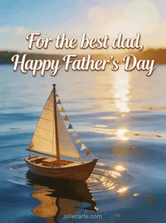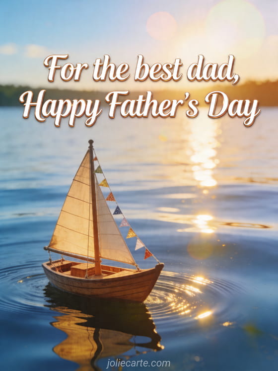 Use a Father's Day card template with elegant white script, a small wooden sailboat gliding on a calm blue lake at sunrise, golden reflections and tiny festive pennants. Discover also a father's day photo, happy fathers day image or loving words for father's day.