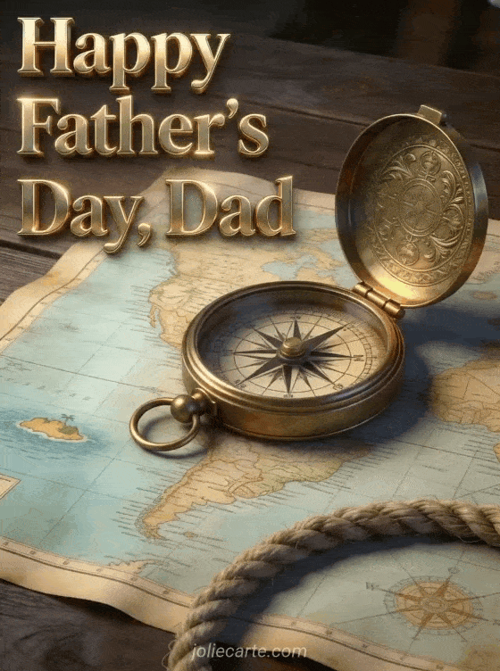 Send Father's Day cards with metallic golden lettering, an antique brass compass opened on a vintage nautical map and a sailor's rope on a dark wooden table. Discover also father's day to my son, a Father's Day card PS or father's day greetings.
