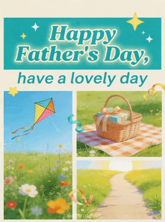 Wish Dad a lovely day with a lively illustrated card showing a colorful kite above a meadow, a picnic basket with a ribboned gift and a sunlit path bordered by bright grass. This fresh design is joyful and easy to share. Discover also a fathers day card, card of father's day or sweet words Father's Day.