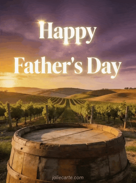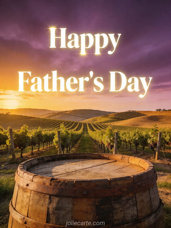 Share father's day greetings with a photorealistic vineyard at sunset, rows of vines over rolling hills, a purple and golden sky and an old wooden barrel in the foreground. Discover also a happy dad's day card, a Father's Day short quote or a Happy Father's Day gif.