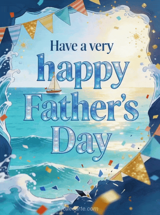 Share a sunny Father's Day image with a small sailboat crossing a turquoise bay, festive bunting, sparkling waves and cheerful confetti. Discover also a happy special day Mom Dad card or a Father's Day card.
