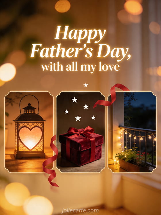 Send a Father's Day love text in elegant ivory script with a luminous outline, shown in a warm collage with a heart-shaped lantern, velvet gift box and quiet balcony garden glowing under fairy lights. Discover also a tie card for father's day, joyful father's day or a father's day tie card.