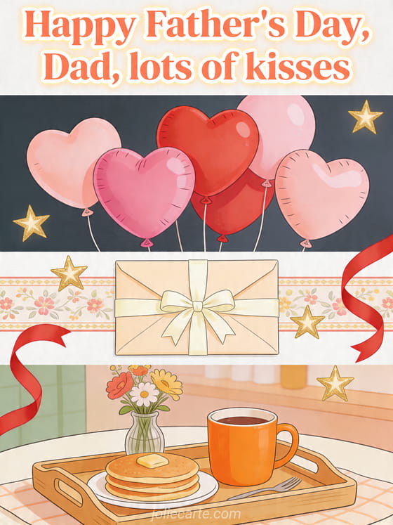Share a lively illustrated Father's Day card with heart-shaped balloons, a sealed envelope with ribbon and a cozy breakfast tray with a bright mug. It is a sweet way to send lots of kisses to Dad. Discover also a dad's day card, happy father's day to my son and all dads or a Father's Day text.