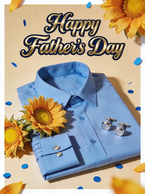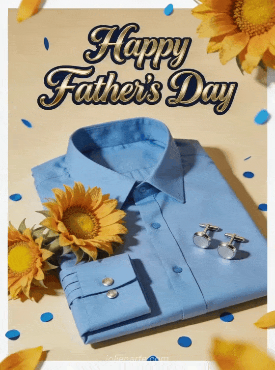 Send an elegant Father's Day shirt greeting card with a photorealistic folded sky blue dress shirt, polished cufflinks, sunflower blooms and crisp blue confetti in warm studio light. Discover also dad's day cards, happy Father's Day dad text or happy mother's day mom and happy father's day dad.