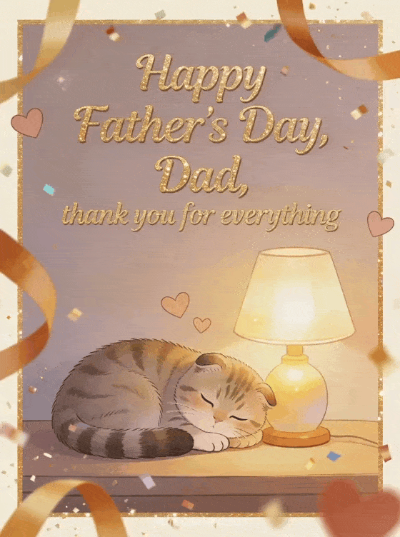 Send Father's Day sweet words with tender cream script, a warm pastel illustration of a Scottish Fold cat curled beside a glowing table lamp, small hearts, amber ribbons and celebration confetti. Discover also wish a friend happy father's day, my love my darling happy father's day or an original Father's Day gif.