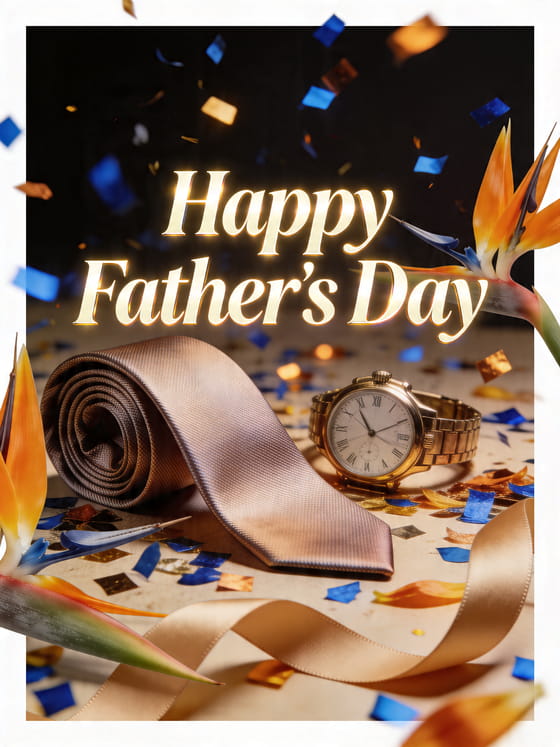 Send an elegant Father's Day tie card with a photorealistic silk necktie curled beside a brass watch, bird of paradise flowers and festive blue and amber confetti. Discover also a happy Father's Day dad card, Father's Day sweet words or wish a friend happy father's day.