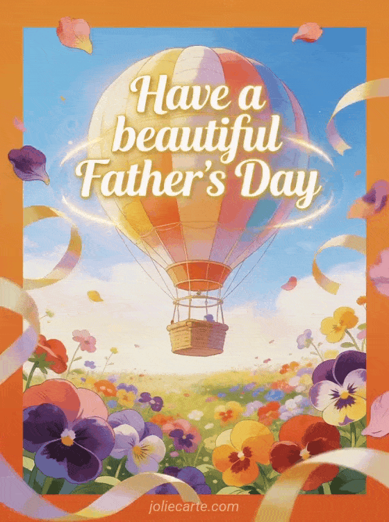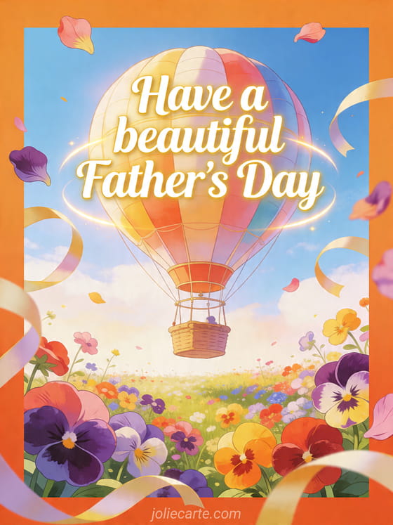 Send a joyful Father's Day greeting with an illustrated hot air balloon floating over a colorful meadow filled with pansies, ribbons and soft glowing sky colors. Discover also a Father's Day card PS, father's day greetings or a happy dad's day card.