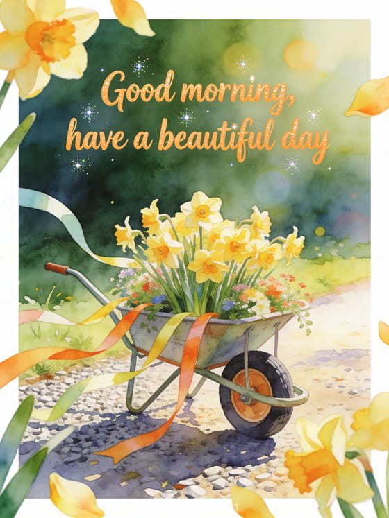 Send a floral good morning card with joyful apricot watercolor lettering, a flower-filled garden cart, daffodils, a sunny gravel path and bright ribbon streamers. Discover also free virtual good morning cards, pretty free virtual good morning card or good morning message for my man.