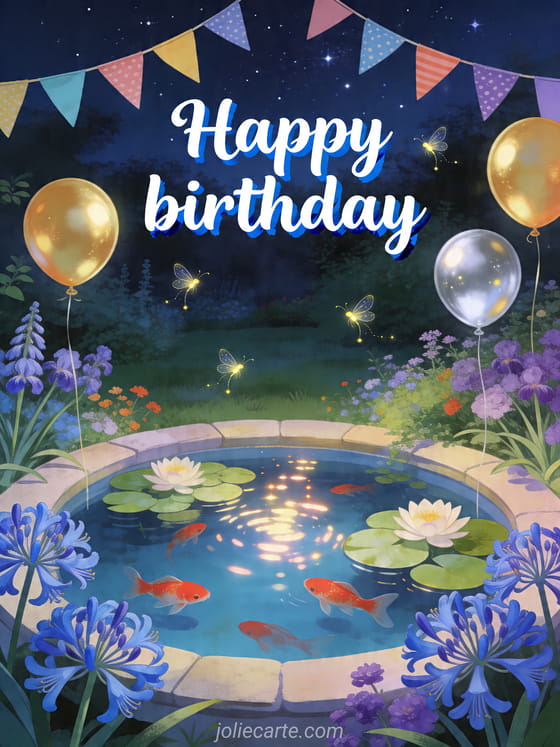 Share a warm happy birthday with this festive card showing a goldfish pond, water lilies, agapanthus, balloons, and sparkling reflections under a starry sky. You can also discover a wish happy birthday from a distance, a words to wish happy birthday, or a happy birthday car.