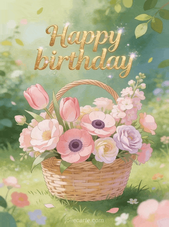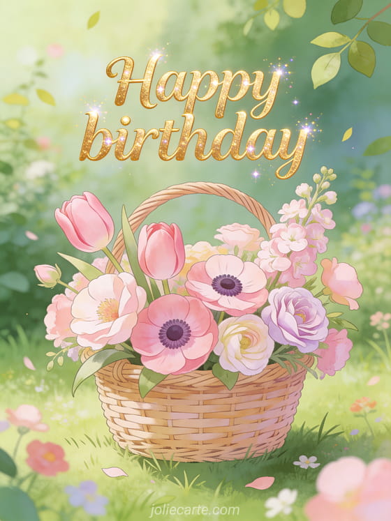 Share a graceful birthday card with pink tulips, anemones, lisianthus in a wicker basket, and a bright garden backdrop. You can also discover happy birthday image with flowers, musical happy birthday, and happy birthday images.