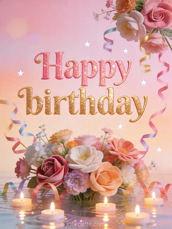 Share a joyful birthday wish with this delicate floral card featuring colorful blooms, floating candles, and sparkling stars on a pastel background. Discover also letter to wish happy birthday, flower bouquet happy birthday and happy birthday cute cat.