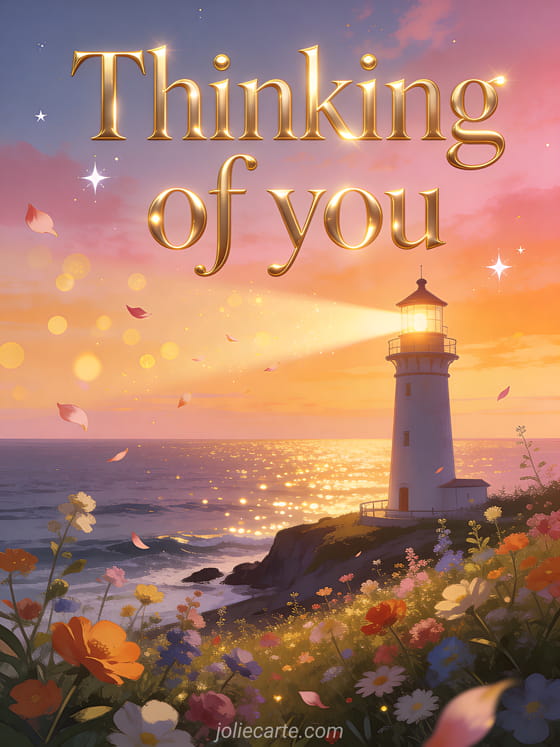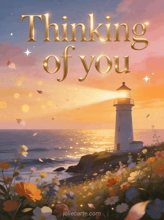Send a tender thinking of you message to someone dear. Let them know they shine in your thoughts like a lighthouse at dusk. Discover also a thinking of you my friend card or a thinking of you card.