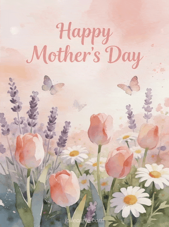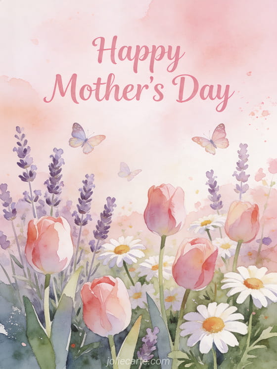 Celebrate Mother's Day with this enchanting free greeting card. A gentle watercolor illustration features a blooming spring garden filled with tulips, lavender and daisies bathed in warm light, with delicate butterflies dancing among the flowers. Discover also a Mother's Day greeting card, a card with sweet words for mom or a Mother's Day animated card.