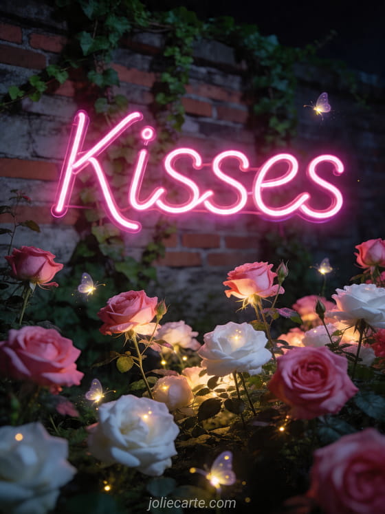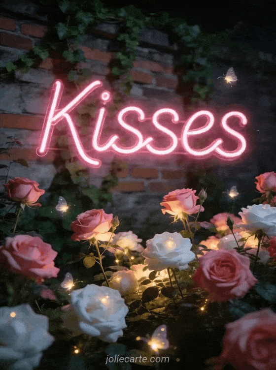 Share a tender kisses message with this romantic card showing pink and white hollyhocks glowing in a night garden with fireflies. You can also discover love kisses couple, kisses image or kisses gif.