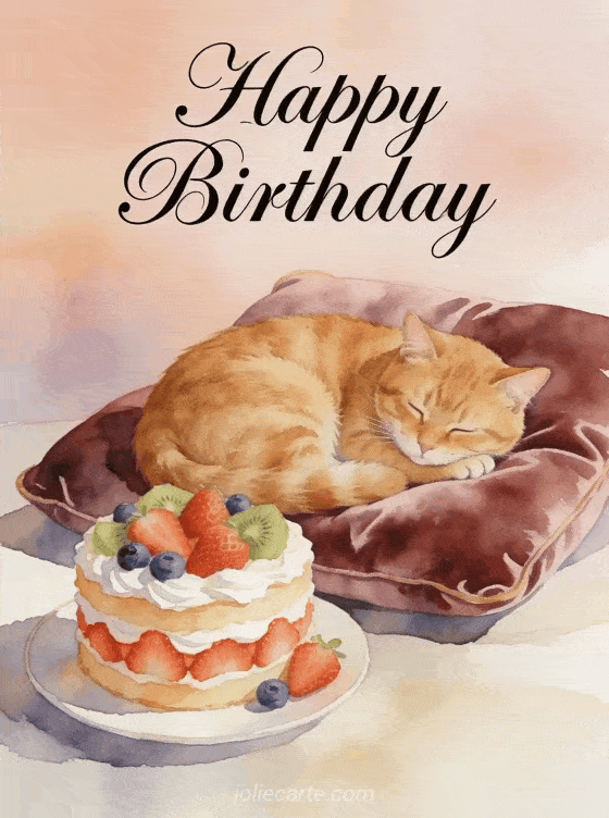Send this charming free animated birthday card with a sleeping ginger cat on a velvet cushion and a fruit-decorated cake. Discover also a happy birthday fireworks animated gif or a happy birthday animated gif.