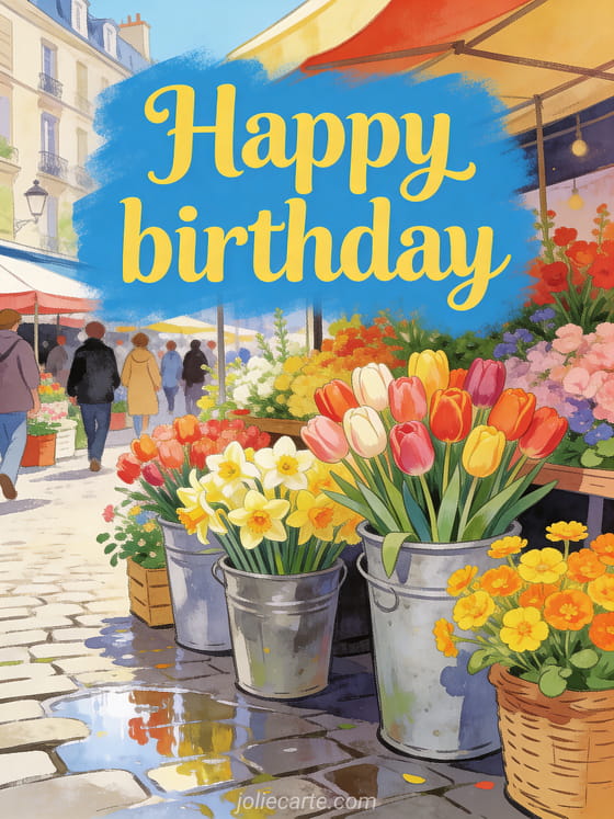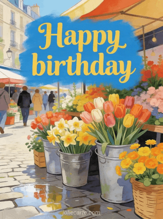 Celebrate with a free animated birthday card inspired by a colorful spring flower market filled with tulips, daffodils, and ranunculus. Discover also dromadaire animated birthday cards, animated happy birthday cat, and happy birthday cat animated gif gif.