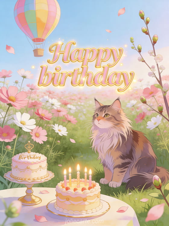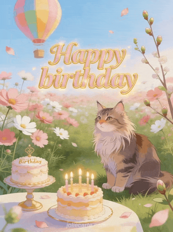 Send a beautiful animated birthday card featuring a Maine Coon cat in a spring field of cosmos flowers, a colorful hot air balloon and a birthday cake with lit candles. A fresh and joyful celebration. Discover also a pretty animated happy birthday card or a free animated birthday card.