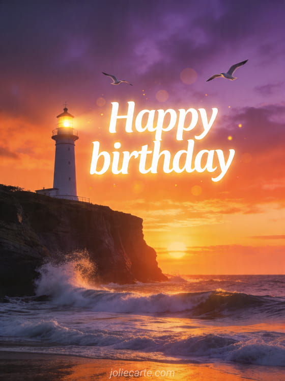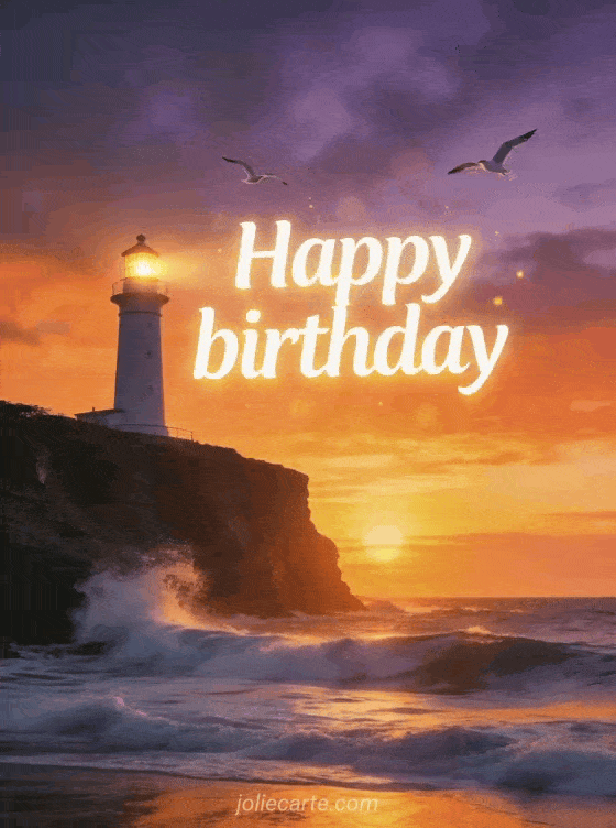 Share a powerful happy birthday with this photorealistic card featuring a lighthouse on a cliff at sunset, crashing waves, and seagulls in the sky. You can also discover free musical animated birthday card man, animated happy birthday boy gif, or animated birthday card 1 year.