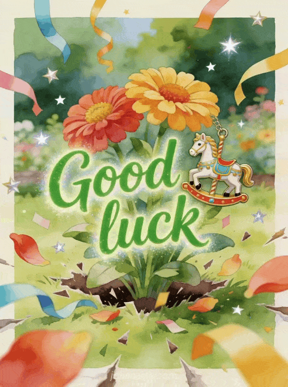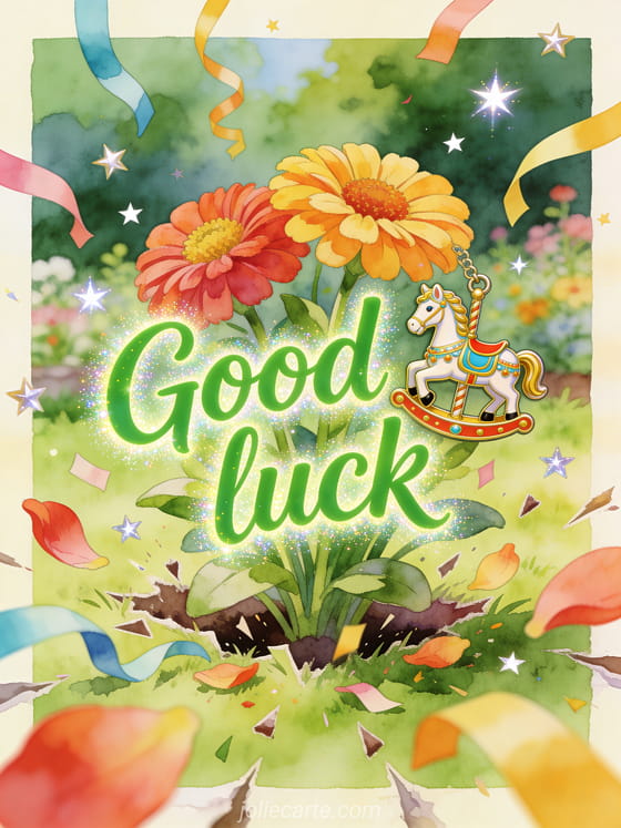 Wish good luck with a bright carousel horse charm, zinnia flowers, paper streamers and shining star confetti in a joyful garden scene. Discover also a good luck competition image, a good luck with your exams gif or a good luck four-leaf clover image.