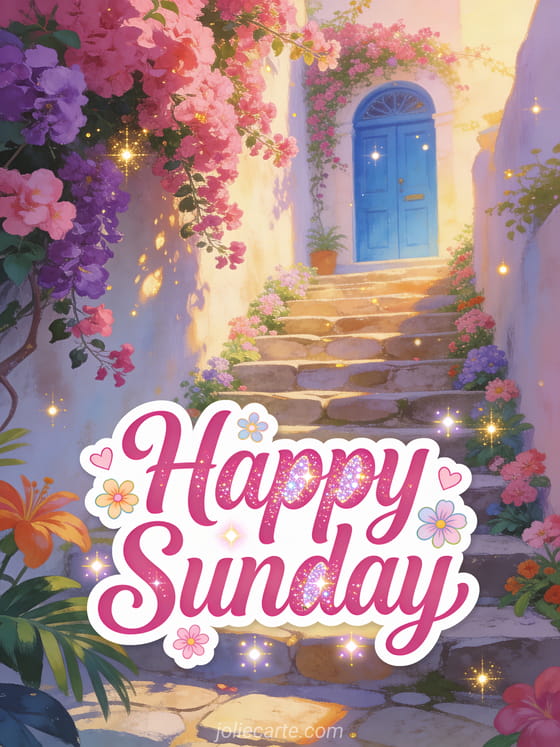 Send a bright happy Sunday greeting with sparkling fuchsia lettering, tropical flowers, glowing hearts and a flowered stone stairway leading to a blue Mediterranean door under cascading bougainvillea. You may also like this happy sunday kisses humor, this have a happy sunday or this very happy sunday kisses.