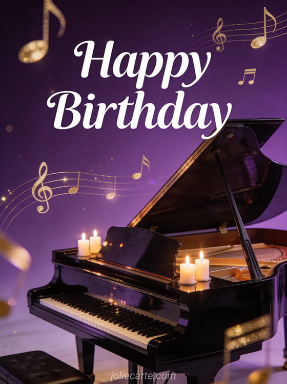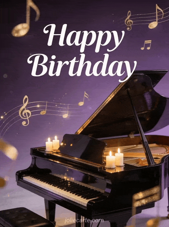 Send this refined free animated musical birthday card with golden music notes floating around a black lacquered grand piano with lit candles. Discover also a birthday animated gif or a free animated birthday card.