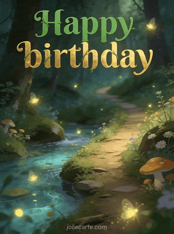 Delight your loved one with this free animated virtual birthday card featuring a magical enchanted forest path with luminous fireflies and fairy mushrooms. Discover also animated happy birthday gifs or a free animated birthday card camel music for more animated options.