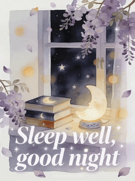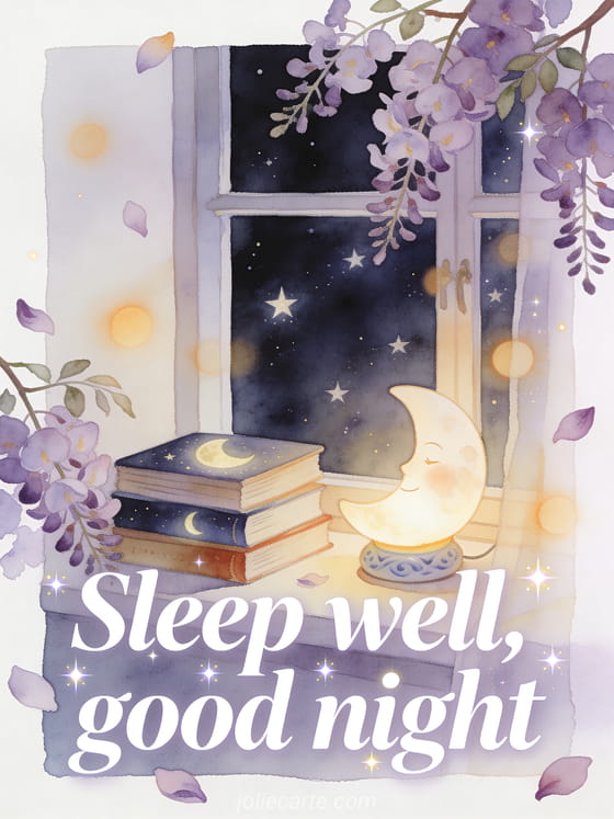 Wish someone sleep well and good night with soft white lettering and a calm moonlit scene. This free card brings lilac branches, stacked books, a ceramic moon lamp and stars beyond the window for a peaceful bedtime mood. Discover also a beautiful good night message card, a good night text message card or a good night darling message card.