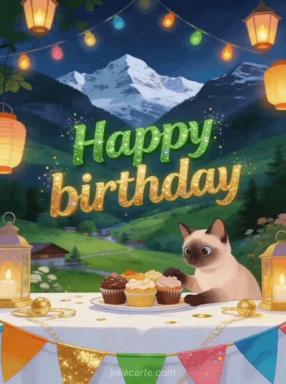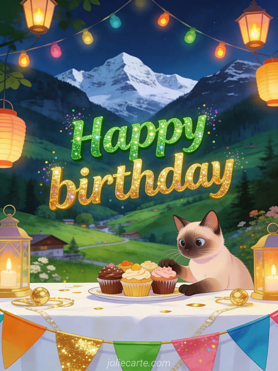 Celebrate with this free birthday card child design showing a cute Siamese cat at a festive table with cupcakes, colorful bunting, lanterns, and a bright alpine mountain valley in the background. You can also discover happy birthday baby banner, happy birthday baby gif, and happy birthday baby card.