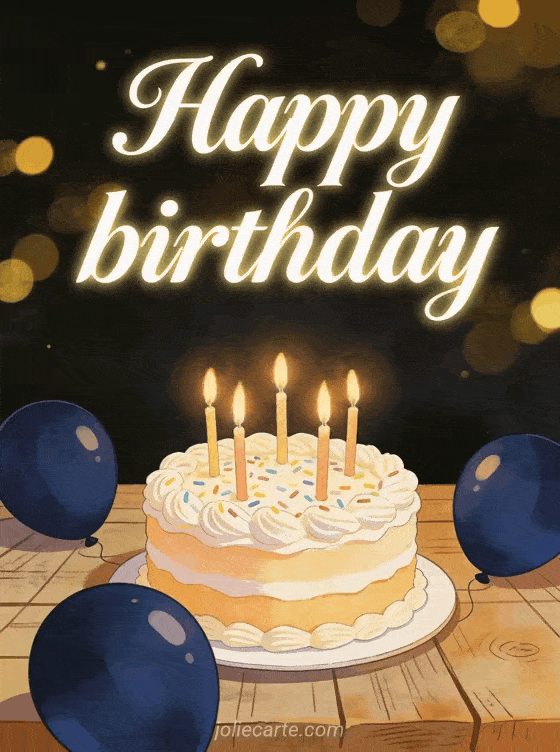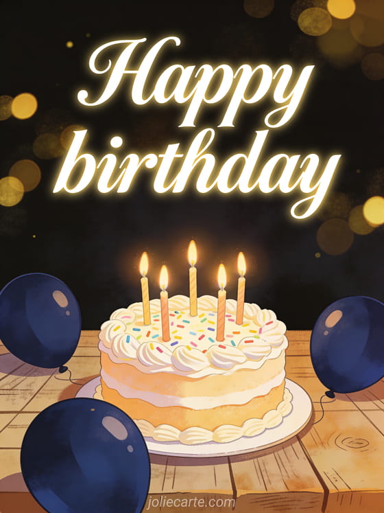 Send the man in your life a special birthday card for free. This warm illustration features a beautiful birthday cake with lit candles on a rustic wooden table, soft golden bokeh lights and dark blue balloons in the background. A classy and festive card to make him smile. Discover also a funny birthday humor for a man or a free happy birthday card for men.