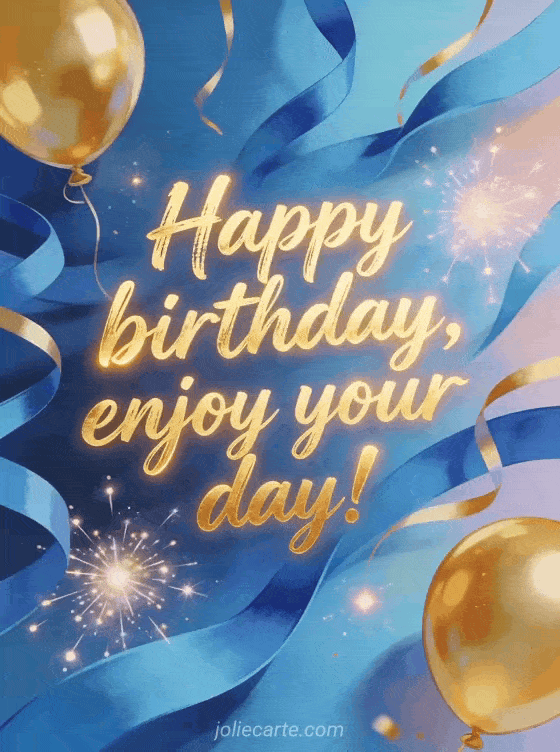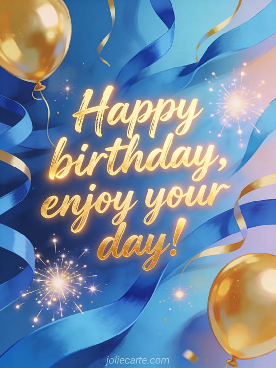 Wish him a great day with a vibrant birthday card featuring modern golden brush lettering, blue streamers, gold balloons, sparkling light bursts, and a dynamic festive layout. You can also send a birthday card man car, a man birthday joke, or a birthday man humor card.