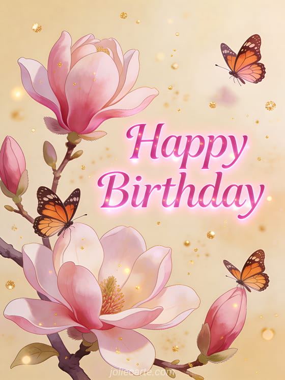 Celebrate a special woman with this tender birthday card featuring fuchsia pink glowing letters, monarch butterflies fluttering around blooming magnolia flowers on a warm cream background with golden particles. Discover also a free birthday gif for women or a birthday card for women.