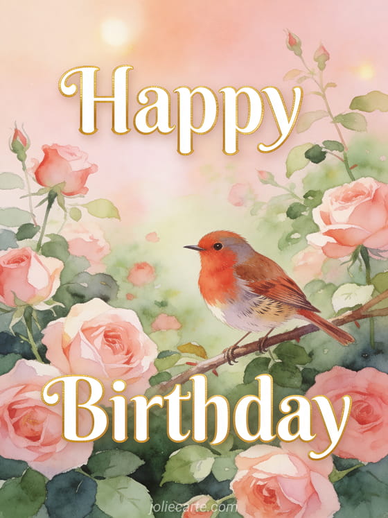 Celebrate a special birthday with this elegant watercolor card featuring a garden of old roses and a robin perched on a branch. Discover also a glamorous champagne birthday card or a birthday poem card.
