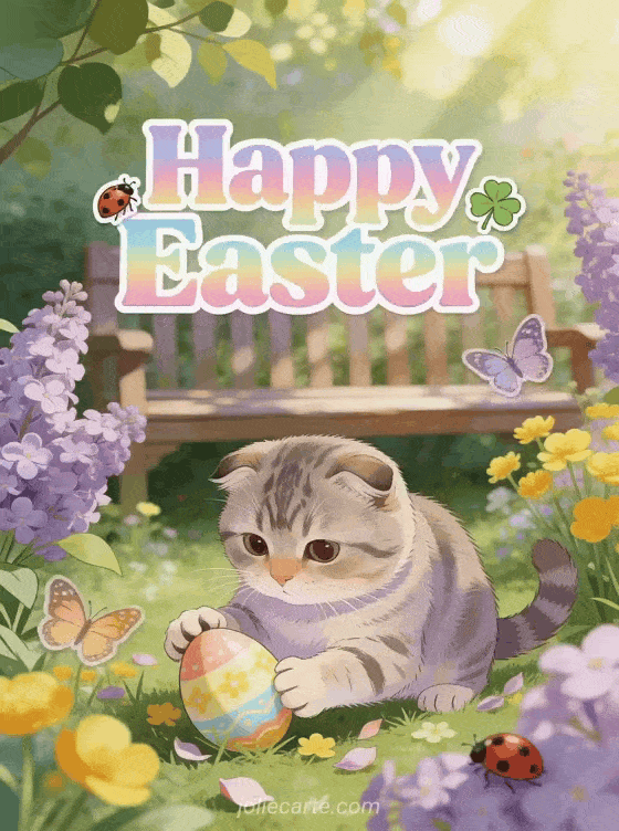 A Scottish Fold cat playing with a decorated Easter egg among lilacs and buttercups in a spring garden — a joyful free Easter card. Discover also pretty Easter cards, an Easter e-card or Happy Easter animated GIFs free.