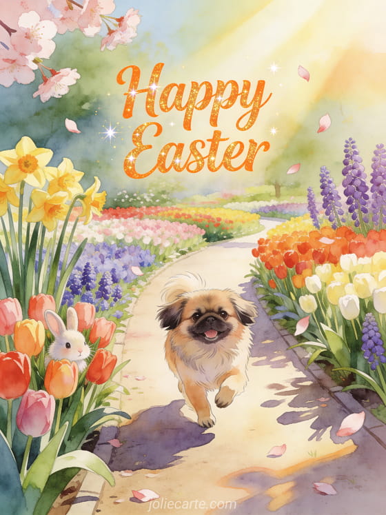 Discover these joyful free Easter cards with a rabbit, Pekingese dog and spring flowers. Discover also free Easter gif or Easter card.