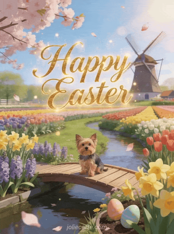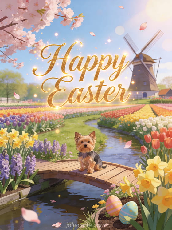 Celebrate Easter with this charming animated greeting card featuring a Yorkshire Terrier on a wooden bridge over a stream lined with hyacinths and daffodils at Keukenhof with multicolored tulips, a Dutch windmill, and cherry blossom petals. Also discover carte virtuelle paques cartes de joyeuses fetes de paques.